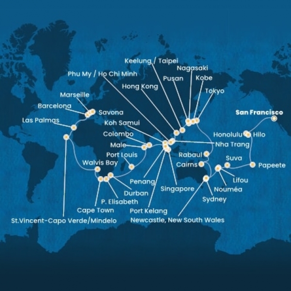 Costa Deliziosa – Amerikai Egyesült Államok, Hawaii, Francia Polinézia, Fiji, Ausztrália, Japán, South Korea, Taiwan, Kína, Vietnám, Szingapúr, Malajzia, Sri Lanka, Maldív-szigetek, South Africa